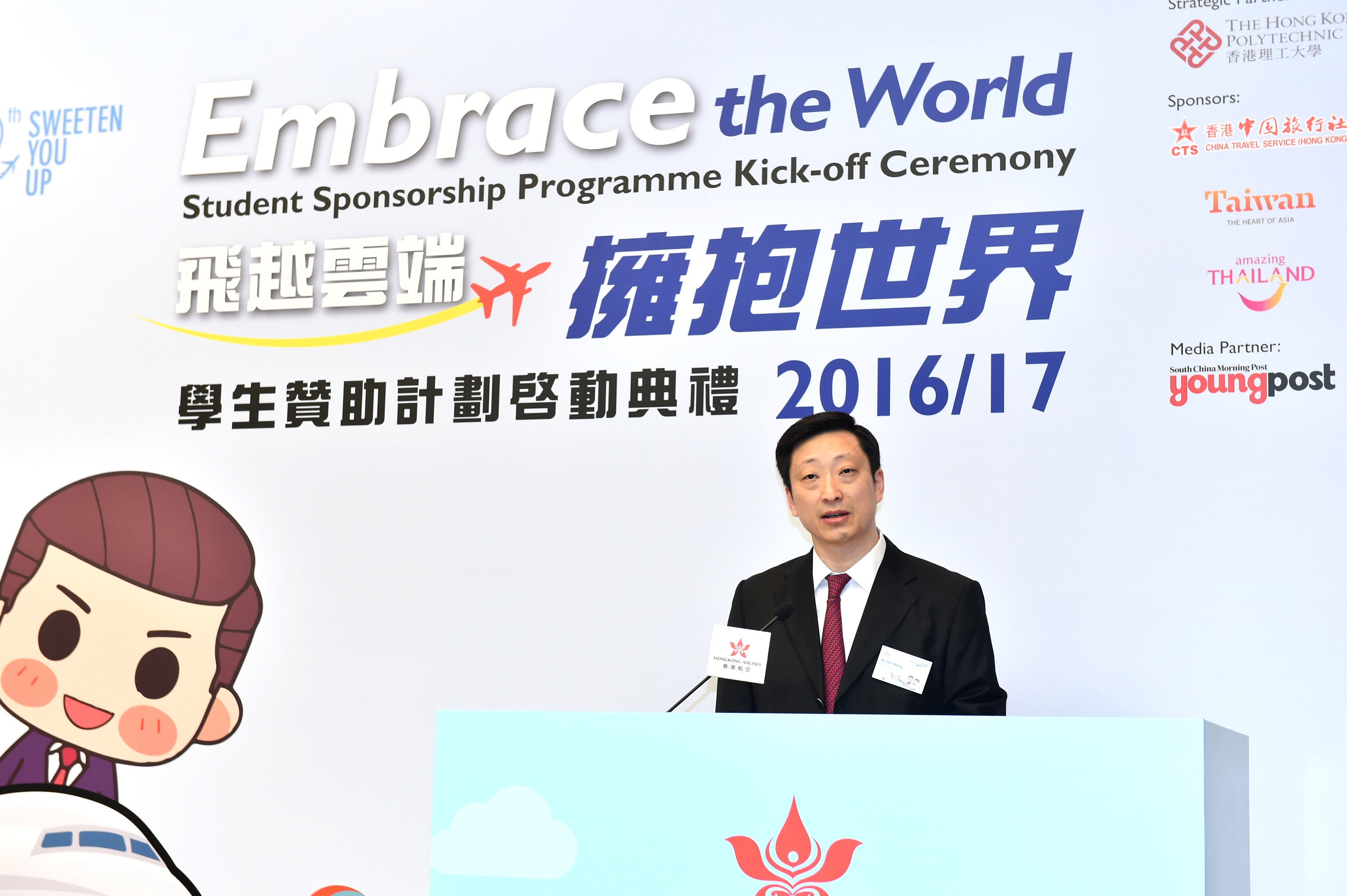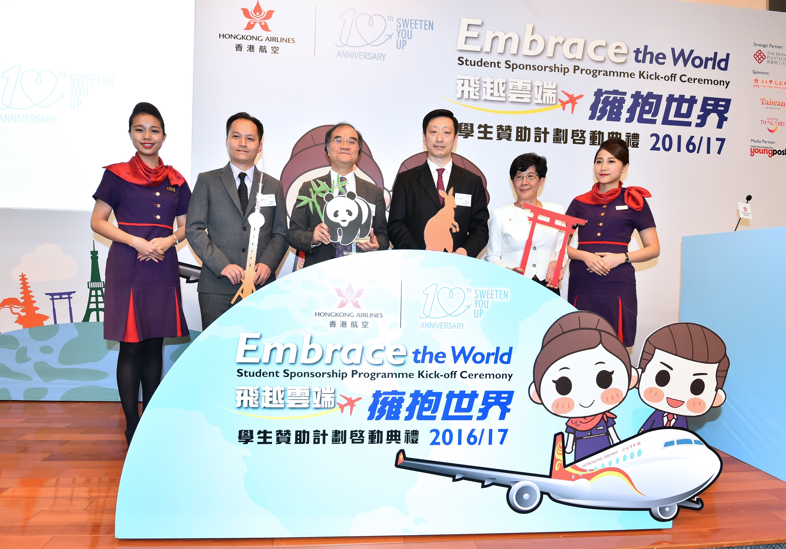 香港航空作爲以香港為家的全服務航空公司,今年再接再厲,舉辦「飛越雲端.擁抱世界」學生贊助計劃 2016/17,並邀得運輸及房屋局副局長邱誠武太平紳士、香港理工大學副校長(學生及環球事務)阮曾媛琪教授、香港航空首席運營官王證皓先生及來自超過60間學校及社福機構代表一同出席今日的啟動典禮,去年憑出色遊記獲「最佳表現學生獎」嘉許的同學,亦於台上分享了參與計劃的心得。除中小學之外,香港航空今年更將計劃擴展至大學及社福機構,共送出機票1,100張,讓更多來自不同年齡層的新世代,贏取開拓國際視野的機會。
