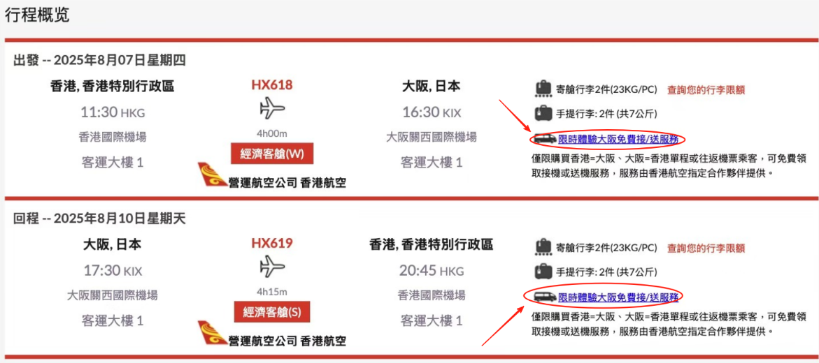 欢迎您选择并购买香港航空香港=大阪航线!为了提升您旅途的舒适性,香港航空为您提供航线专享礼遇-免费接送机服务。